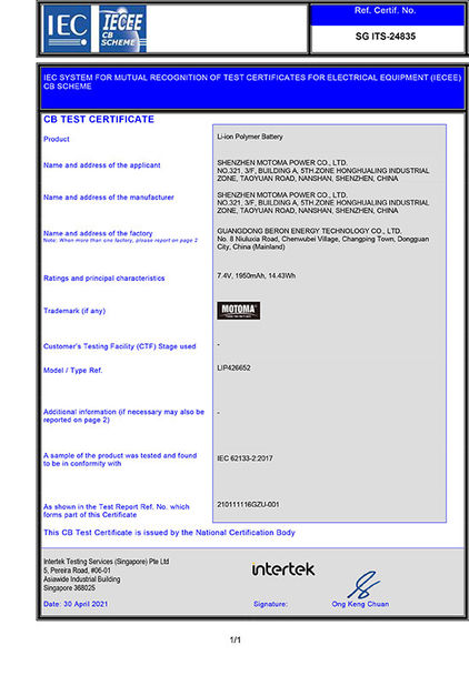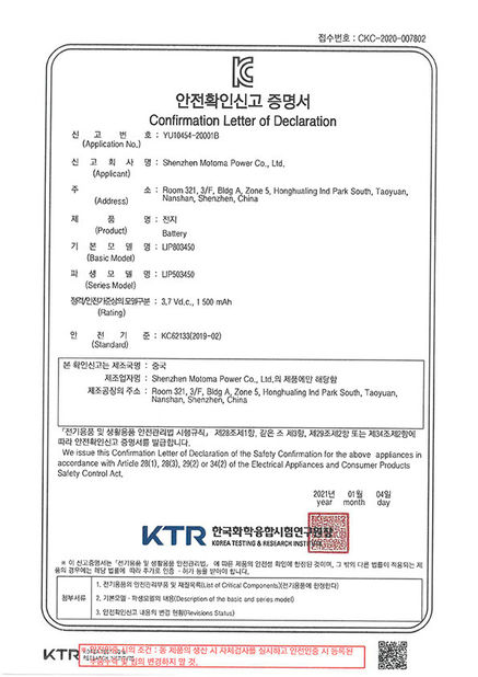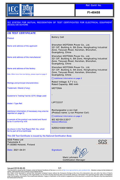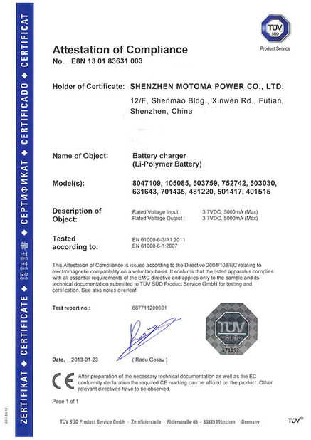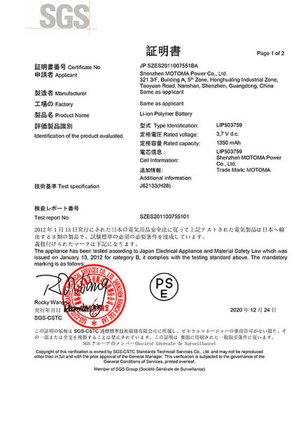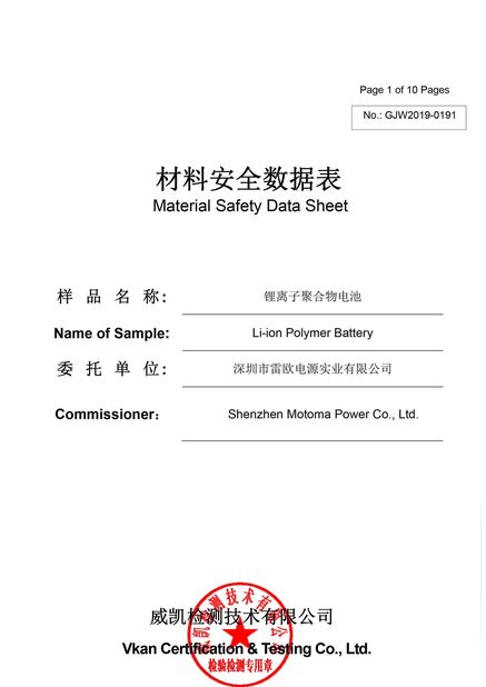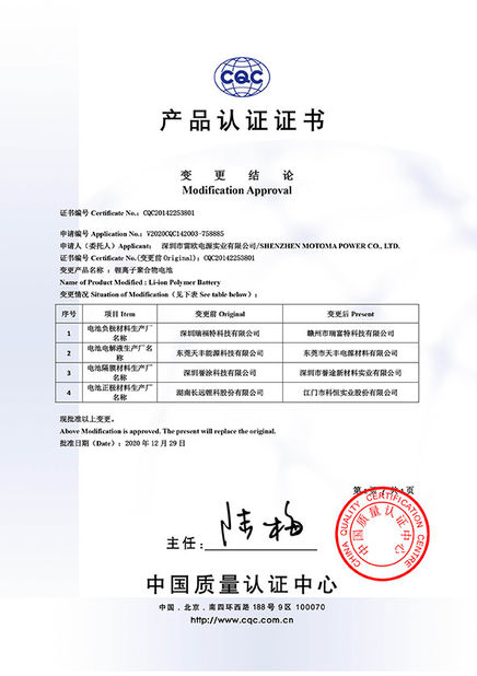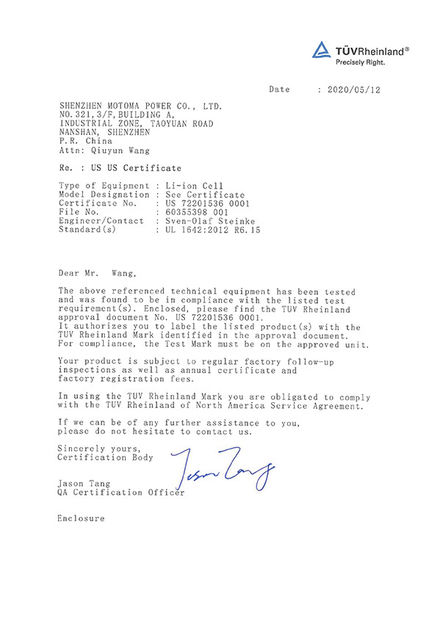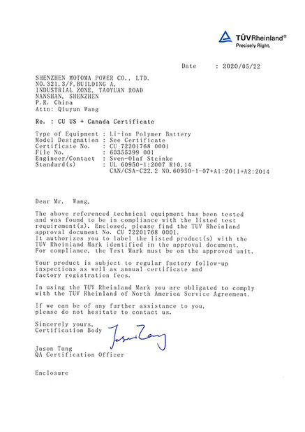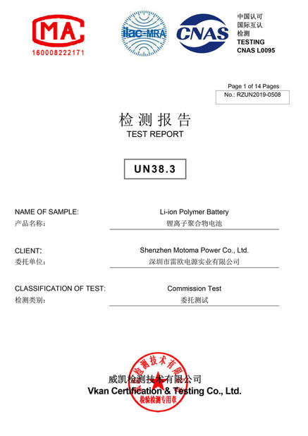 As baterias de MOTOMA aplicam-se com certificados: ISO9001, ISO14001, RoHS, UL, CE, CB, BIS PSE, KC, IEC62133, CQC, UN38.3 e MSDS.